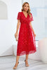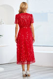 Sequin Leaf Embroidery Tie Front Short Sleeve Dress